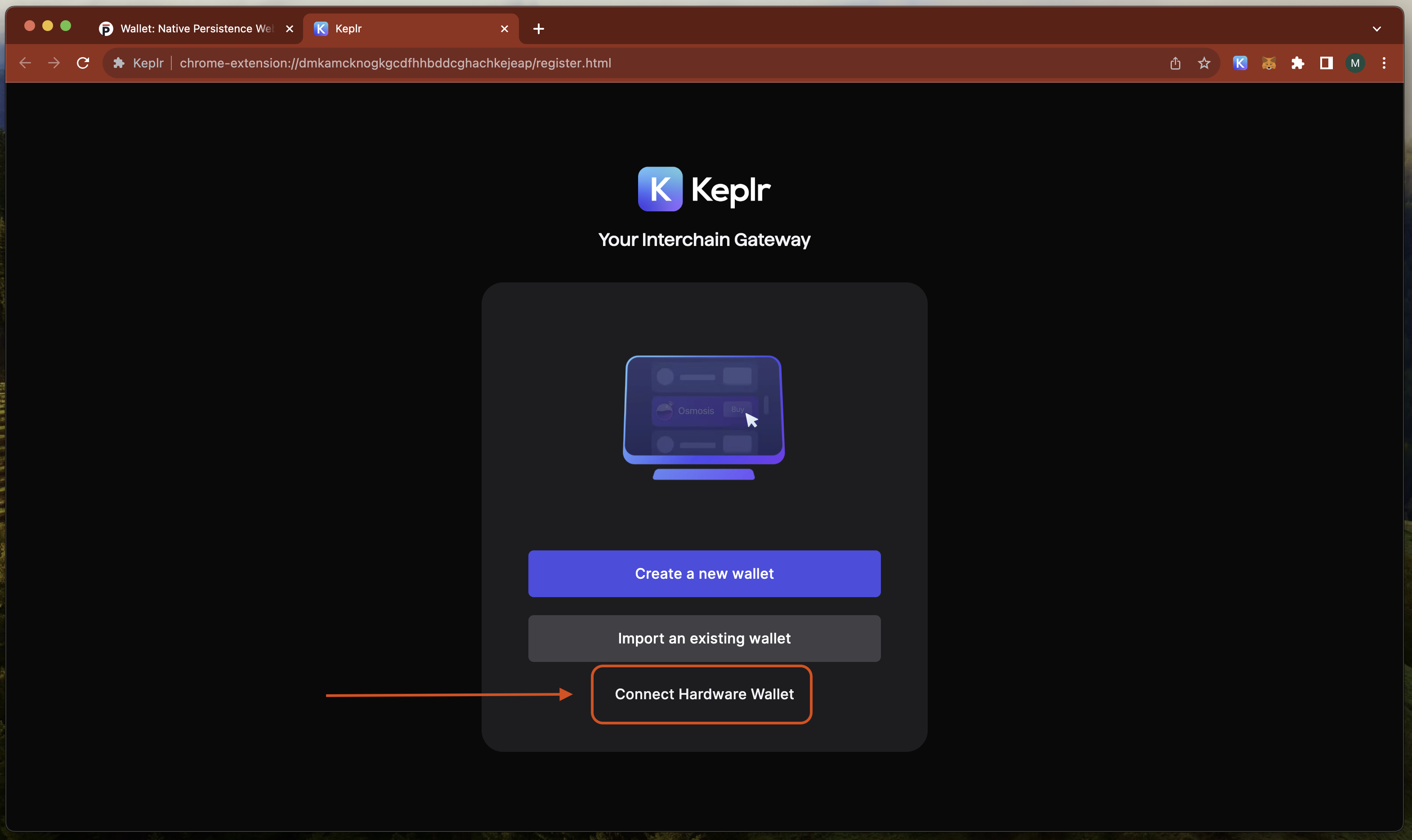 In this step we will import your ledger into keplr so that you can access your 118 coin-type wallet address.