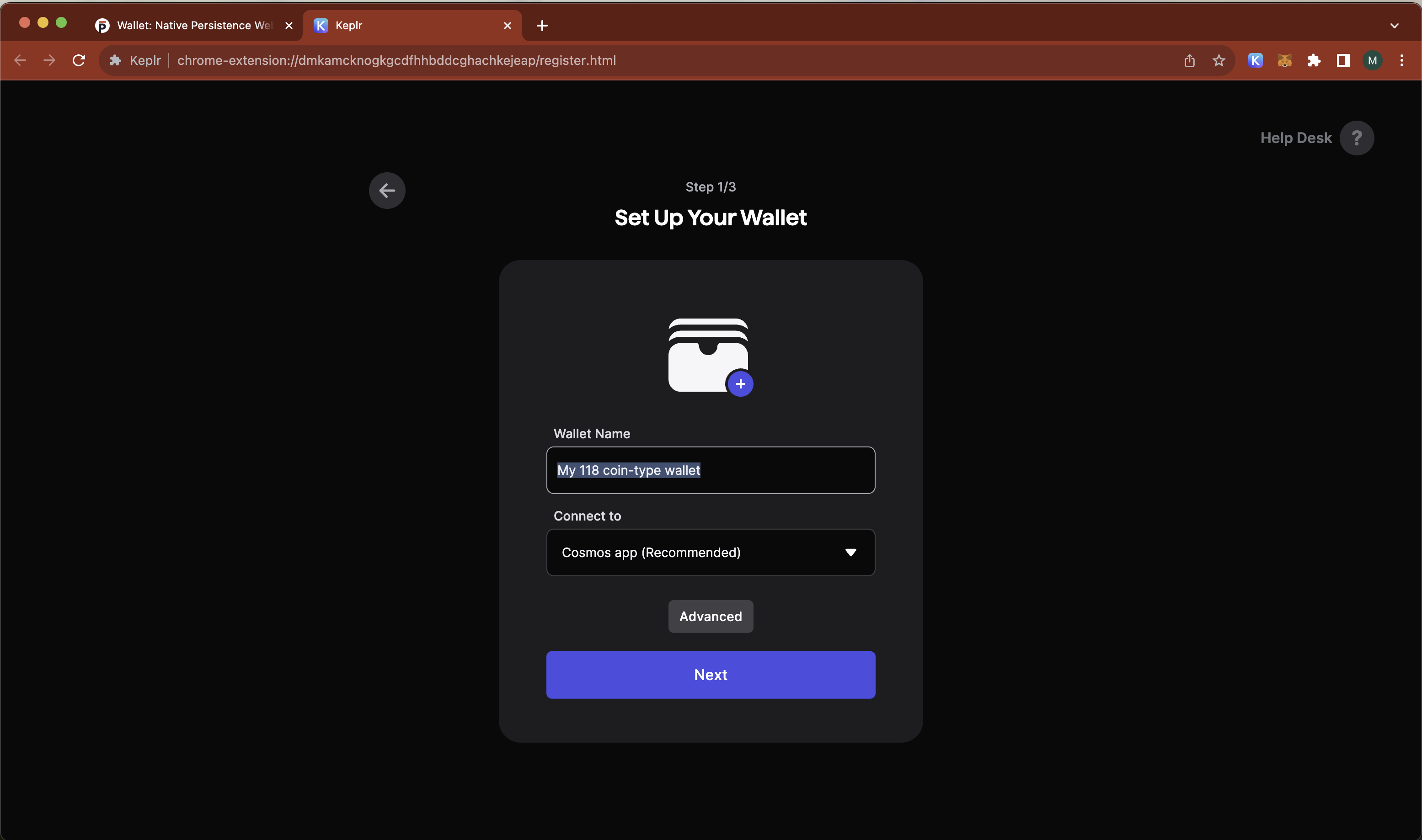 C. Name the wallet as 'My 118 coin-type wallet' (Don't worry you can change your wallet name later too) using Cosmos App as recommended.